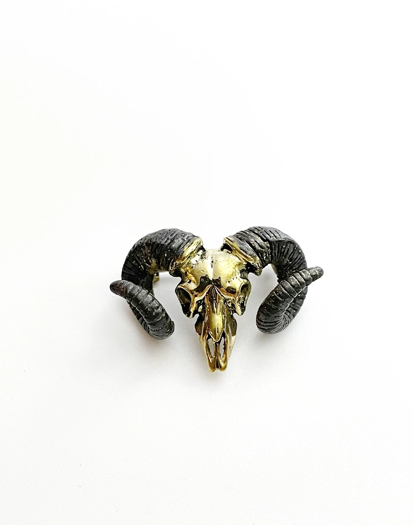 Aries Ram Skull Brooch in white bronze with blackened horns — a sculptural, symbolic statement piece inspired by Aries. Bold, collectible jewelry for refined styling.