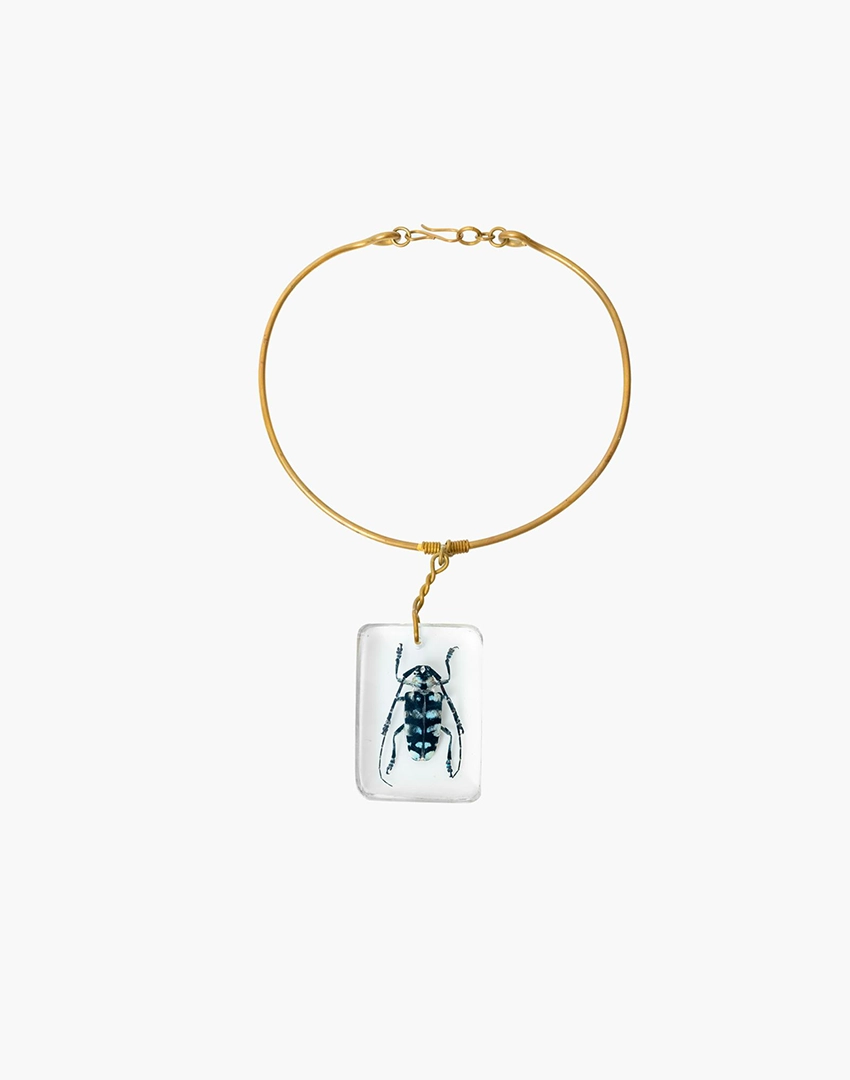 The pendant is finished with a brass necklace, adding weight and character to the piece while complementing the organic form of the beetle.