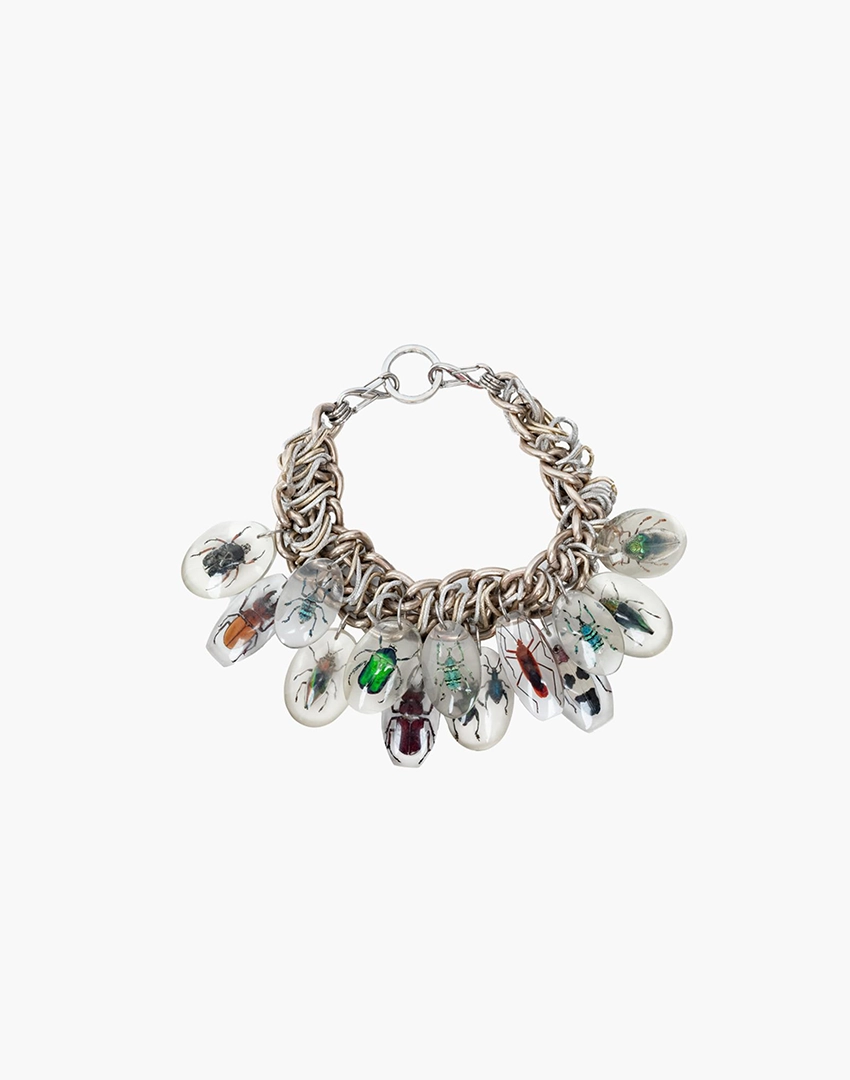 Mounted along a chunky statement chain, the piece transforms these remarkable insects into a powerful wearable object.