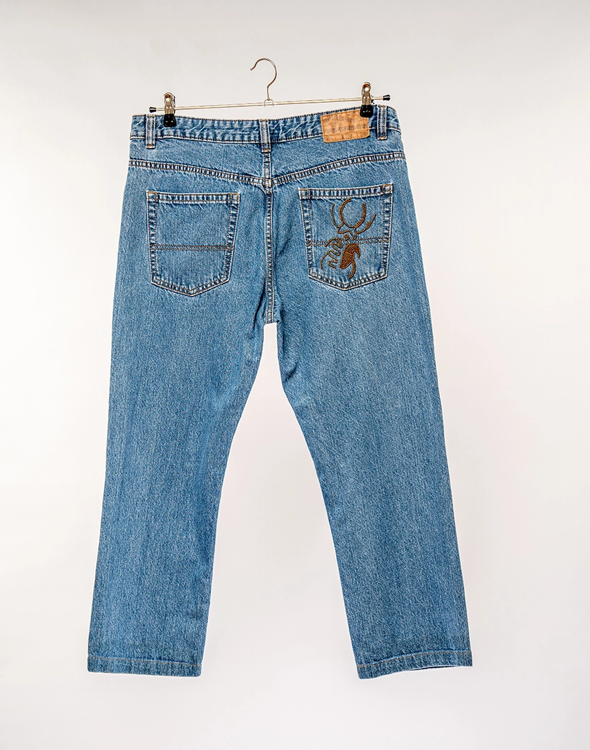 Our curated jeans are given a new life, blending timeless style with unique artisanal detailing and an Akire logo beaded scarab beetle on the back pockets, part of the signature story.