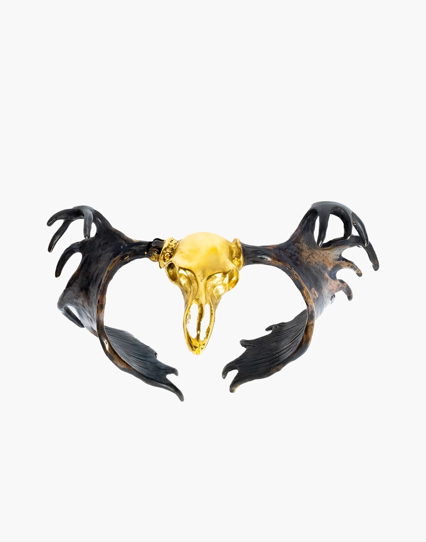 Made in the true colour of white bronze — no plating — the metal can be polished to restore its natural glow, while the blackened horns are intentionally left untreated to preserve their dramatic finish over time.