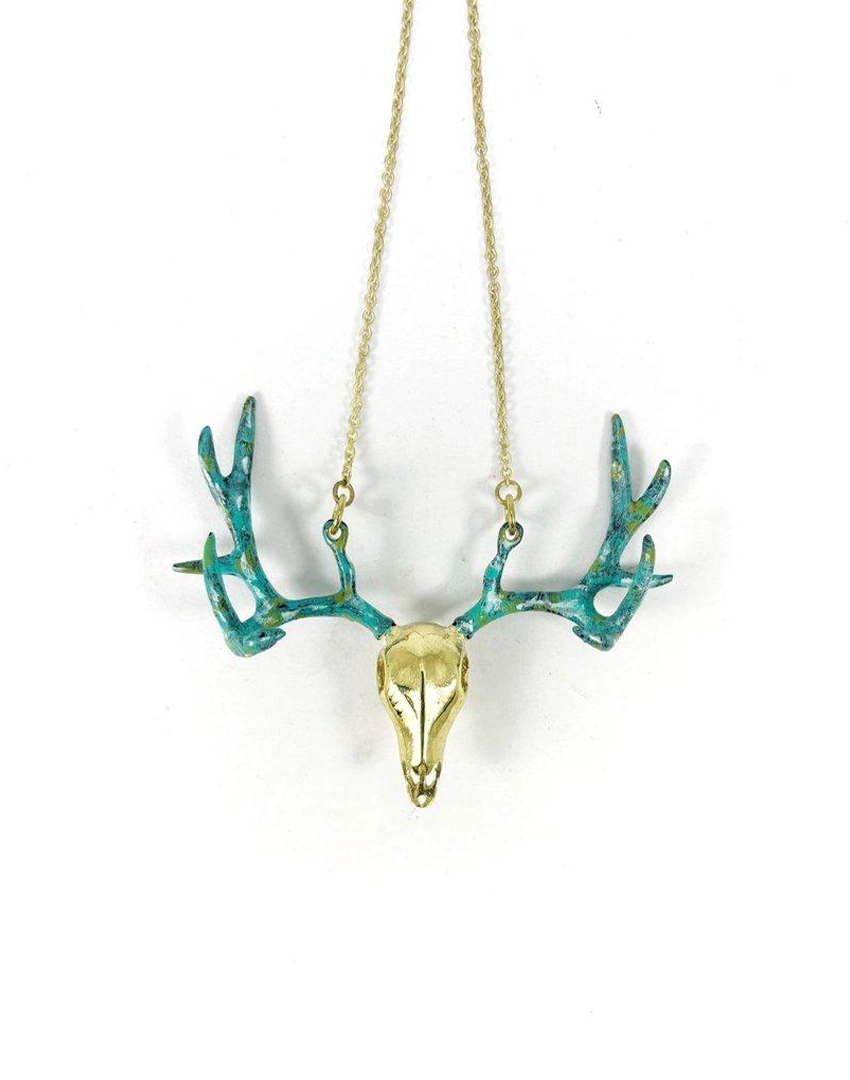Product Details: Brass Stag Skull Pendant Necklace – Patina Antlers