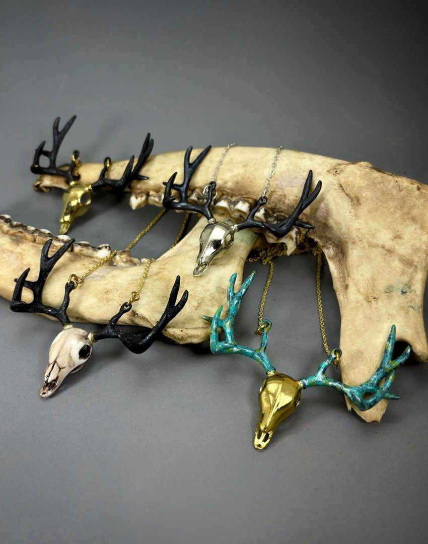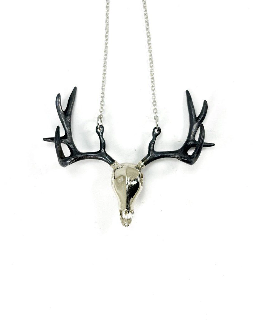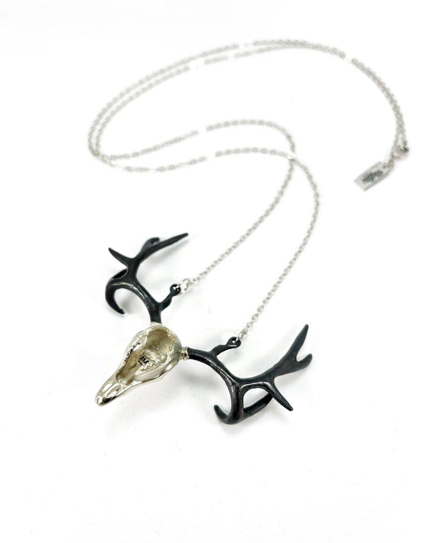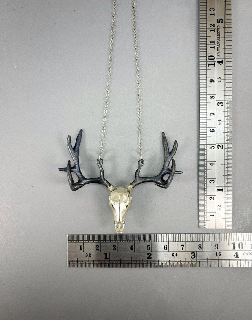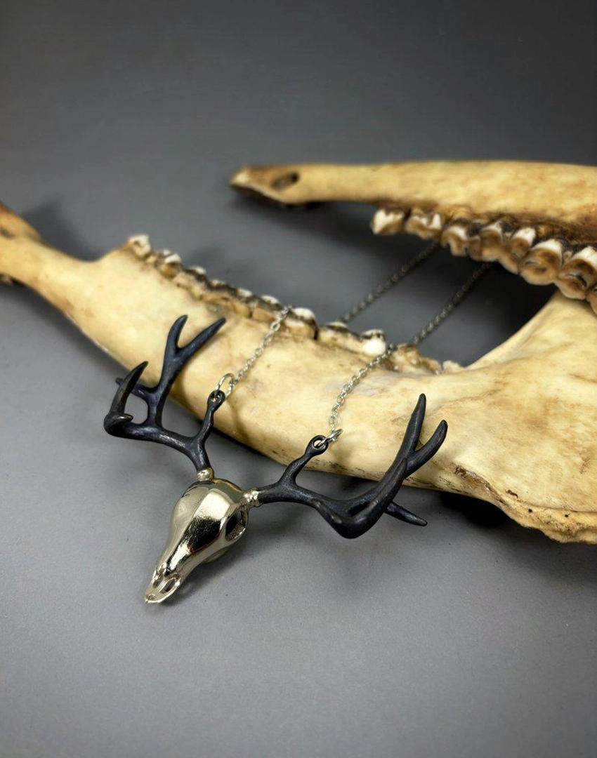 Product Details: Golden Stag Skull Pendant Necklace – White Bronze