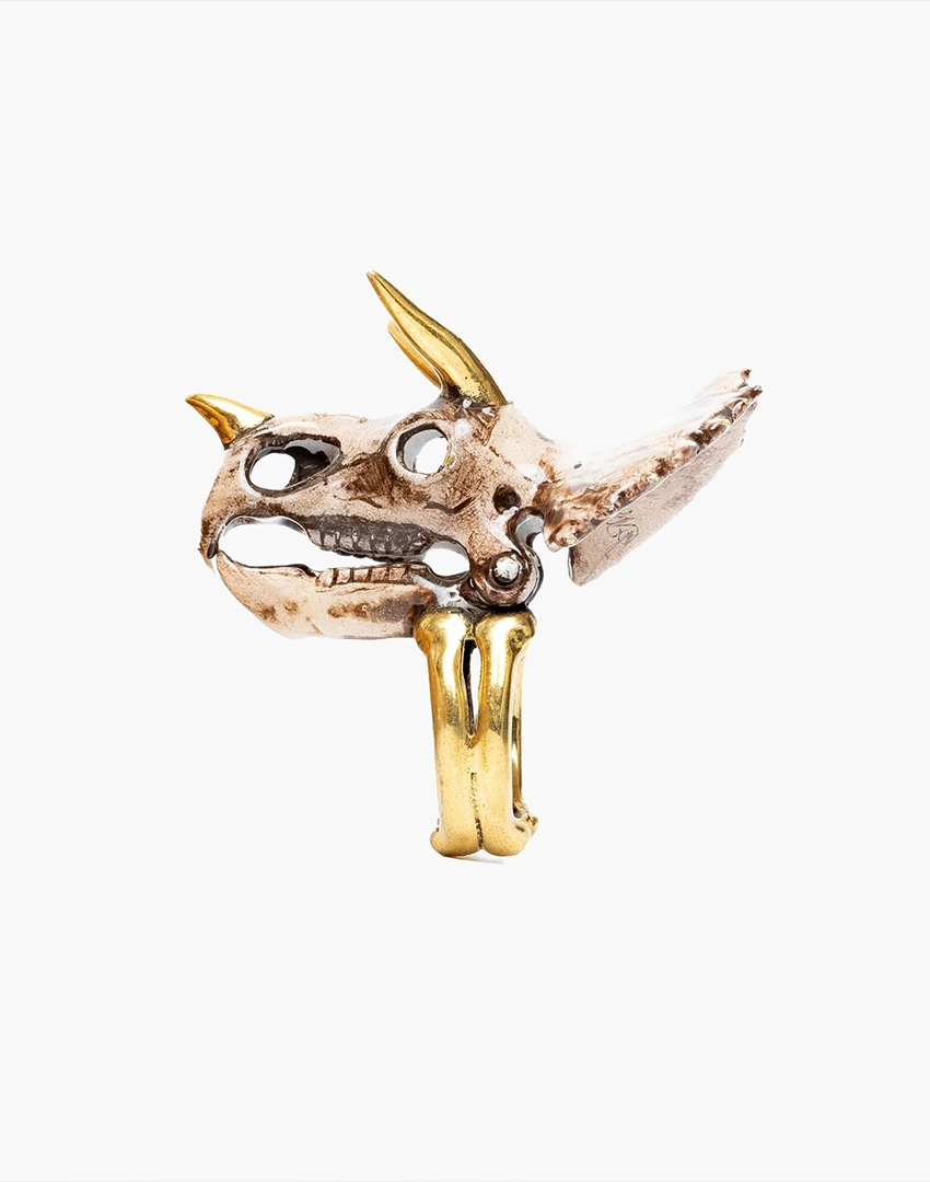 A bold ring inspired by the fossil form of the Triceratops skull.