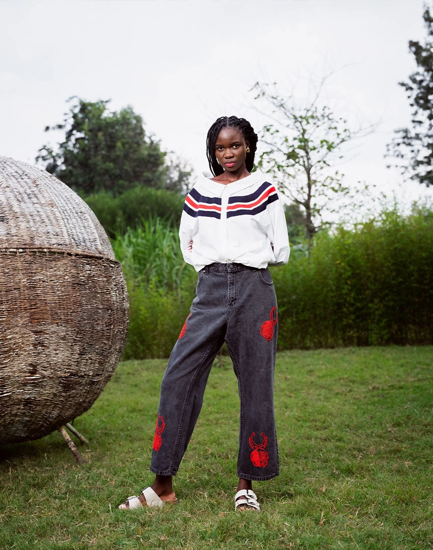 Red scarab beetle beadwork adds a sharp focal point. Each bead detail brings texture and contrast against the dark denim. You stand out without loud graphics.