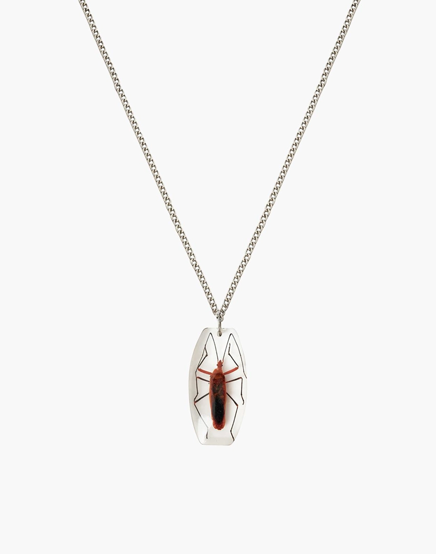 A bold beetle chain necklace featuring a curated set of preserved beetles cast in clear resin, including jewel beetles, ground beetles, and tiger beetles.