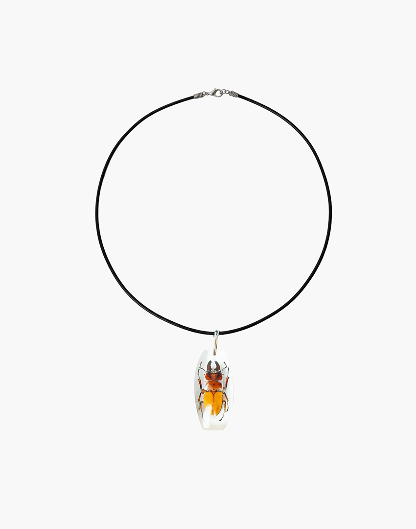 Finished with a leather strap, the piece balances raw nature with crafted design, turning the beetle into a distinctive statement accessory that celebrates the fascination and detail of the natural world.