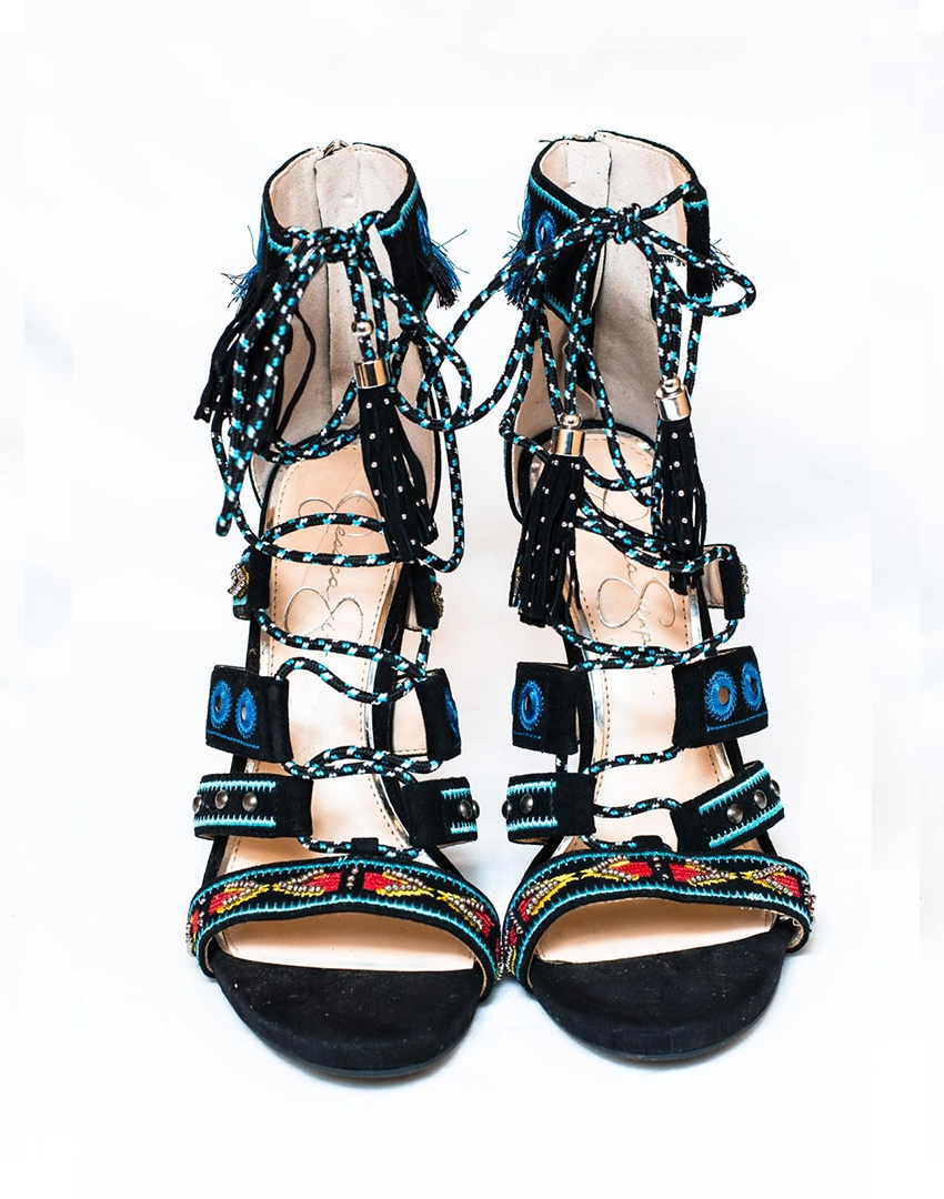 This Jessica Simpson heel is expressed through a striking tribal composition where blue, black, and red lead in bold harmony, creating a visual language that is both grounded and expressive.