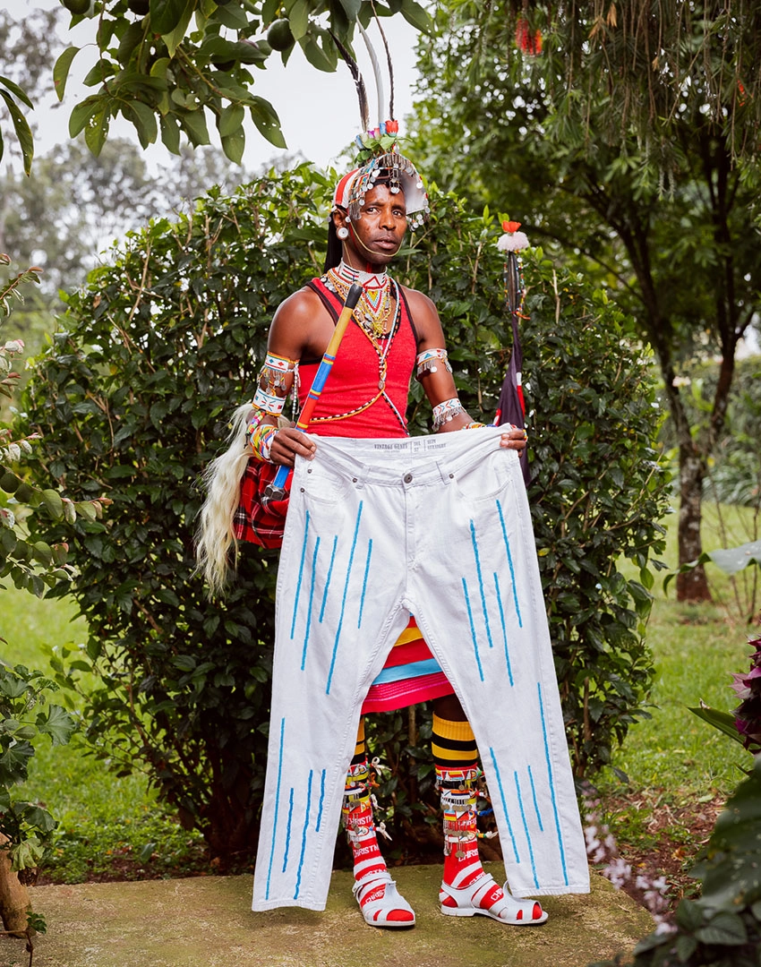 This upcycled denim piece embodies the meeting point of heritage, craft, and conscious fashion. The Maasai man carries the pride of his tradition.