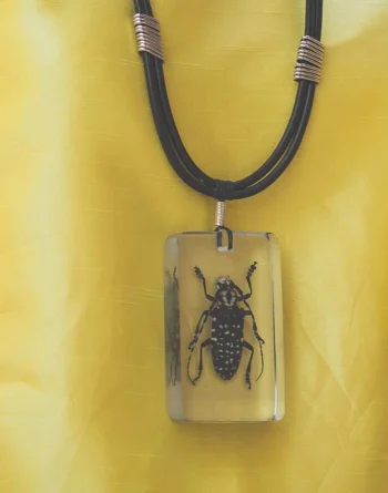 The resin casting allows the intricate details of the beetle’s body to be fully visible, transforming this remarkable insect into a striking design piece.